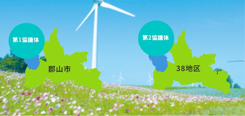 郡山市では市全域を範囲とした協議体が1つ、さらに細かい範囲として郡山市社会福祉協議会の38箇所ある地区・支部社会福祉協議会をエリアの範囲とした協議体の設置を進めています。